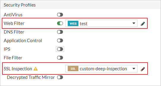 2. 방화벽 정책에 해당 profile을 적용한다. 단 SSL Inspection은 Deep Inspection을 설정한다.
