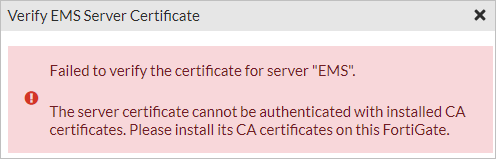 이는 FortiEMS의 CA인증서가 FortiGate에 없어서 FortiEMS의 인증서를 FortiGate가 신뢰할 수 없어 발생하는 것이다.